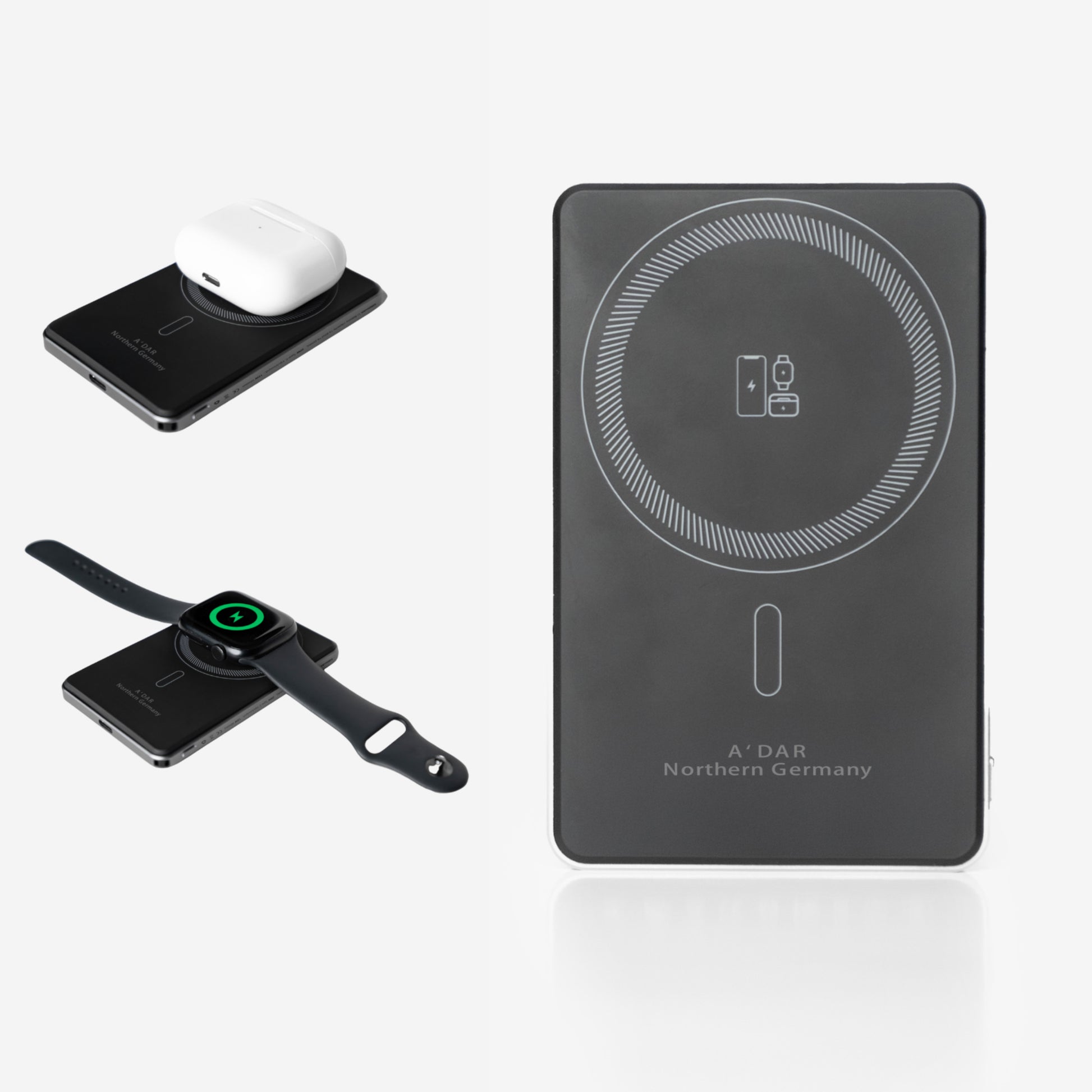 - iPhone 8–11, Samsung e outras marcas: carregam sem fios, fixam-se magneticamente com o anel magnético ou com a capa AdarCharge