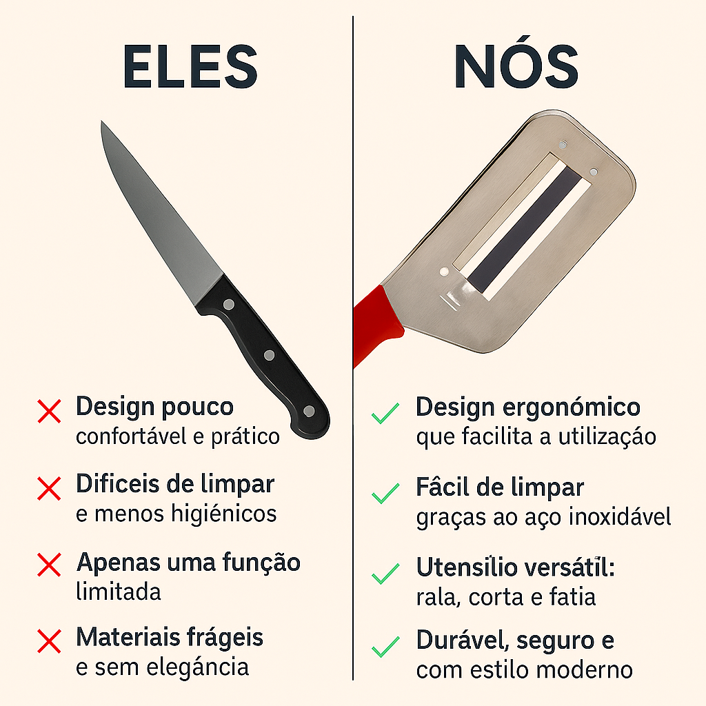 - 🥒 Versátil: Para além de ralar, este utensílio versátil também corta e fatia uma variedade de ingredientes, tornando-se indispensável na preparação das suas receitas favoritas.